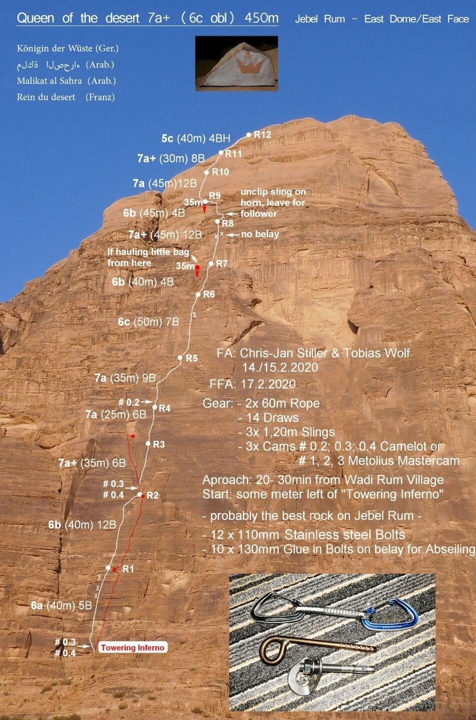 Voie ouverte du bas en 2000 par Guy Abert, Philippe Batoux, Hervé Bouvard, Alon Hod, Arnaud Petit et Benoît Robert. C’est la première voie du Wadi Rum entièrement équipée.